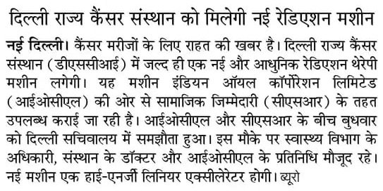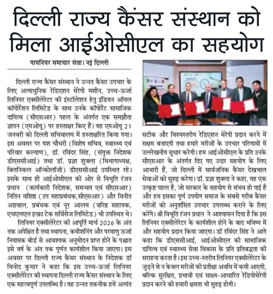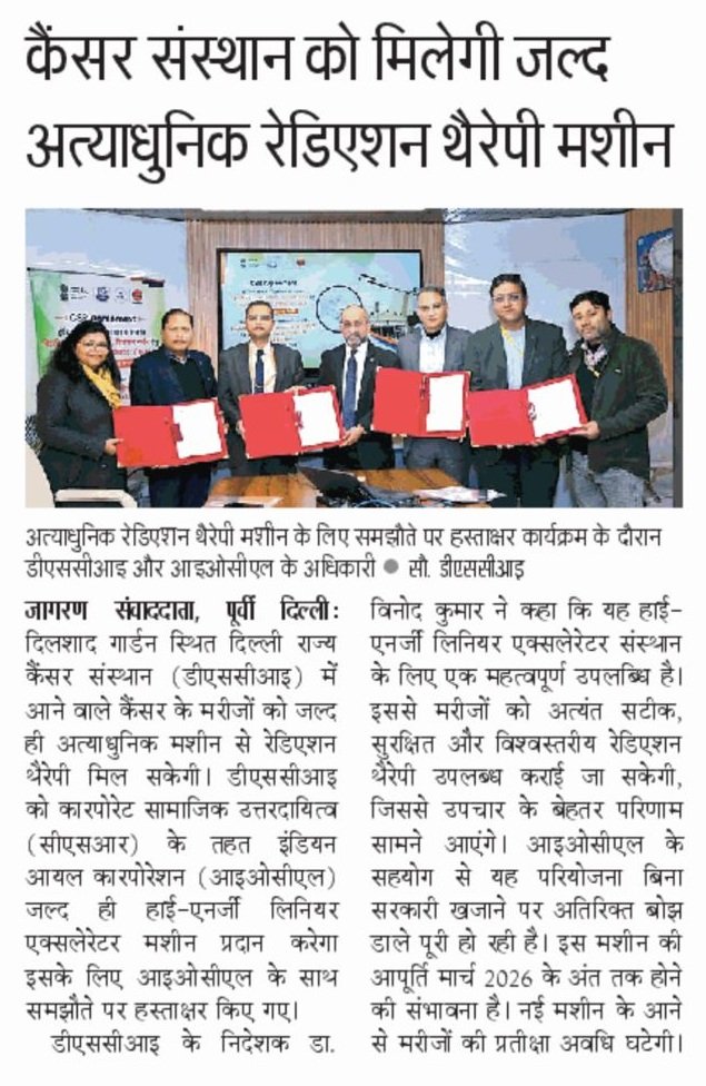 दिल्ली राज्य कैंसर संस्थान (DSCI) ने एडवांस कैंसर इलाज के लिए अत्याधुनिक रेडिएशन थेरेपी मशीन, उच्च-ऊर्जा लिनियर एक्सीलेरेटर की इंस्टॉलेशन हेतु इंडियन ऑयल कॉर्पोरेशन लिमिटेड (IOCL) के साथ उनके कॉर्पोरेट सामाजिक दायित्व (CSR) पहल के अंतर्गत एक समझौता ज्ञापन (एमओयू) पर हस्ताक्षर किए हैं
